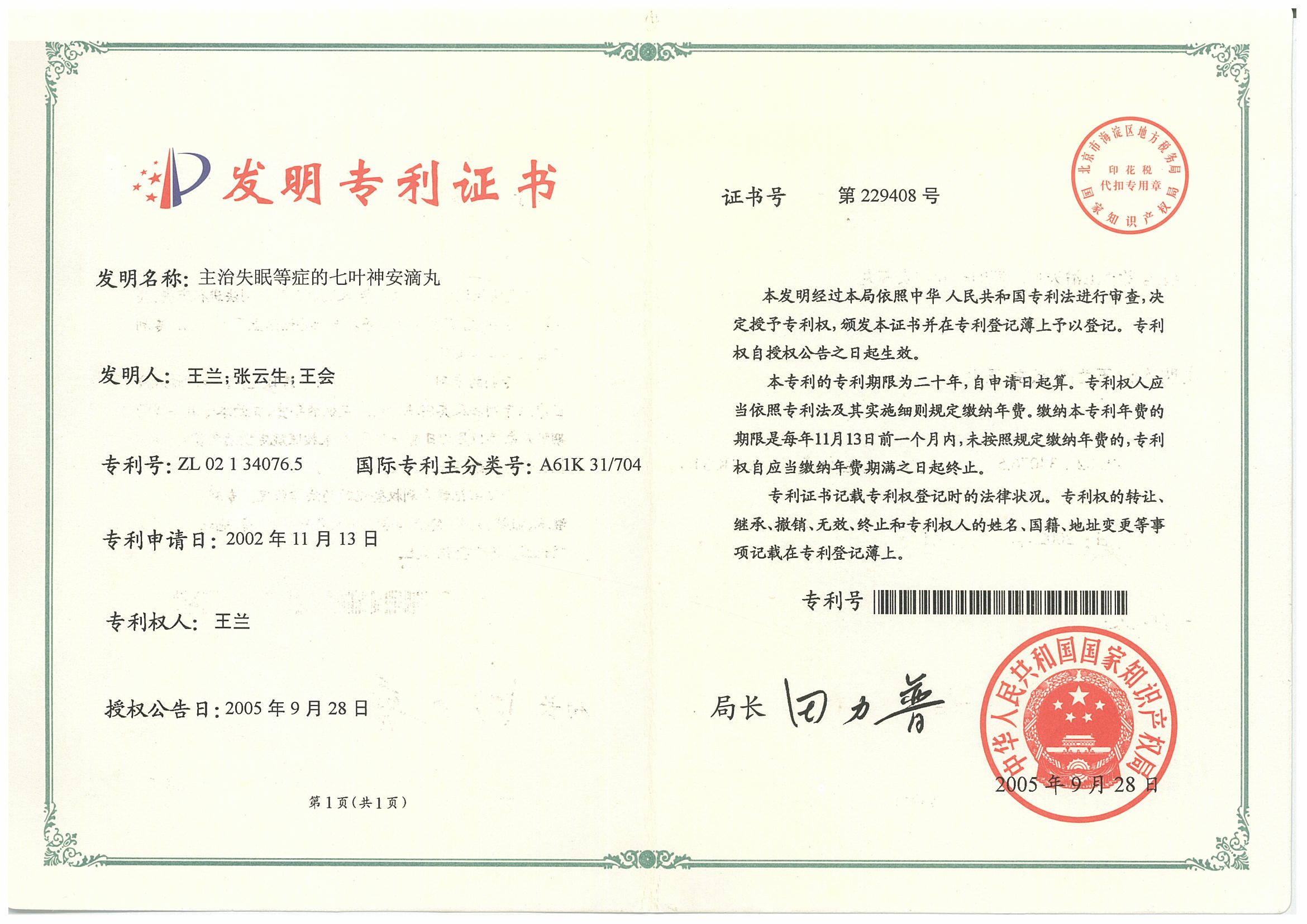 打造企業的持續發展競爭力。通過多年的努力,公司申報了專利55項、獲得專利授權33項,取得國家新藥證書1個,藥品生產批準文號8個,保健食品批準文號2個,其中藥品七葉神安滴丸、保健食品三七口服液為全國獨家專利品種。